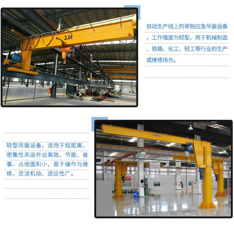 懸臂吊起重機是為適應(yīng)現(xiàn)代化生產(chǎn)而制作的新一代輕型吊裝設(shè)備,配合了可靠性高的環(huán)鏈電動葫蘆尤其適用于短距離,使用頻繁,密集性吊運作業(yè),具有高效、節(jié)能、省事、占地面積小,易于操作與維修等特點。