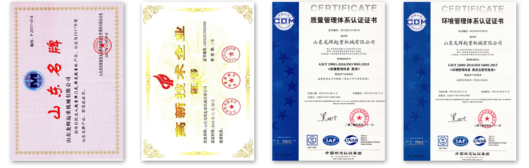 山東龍輝起重機械有限公司創立于2005年,企業注冊資金3.18億元,是國內集研發、生產、銷售于一體的起重機械專業制造商。榮獲山東省名牌產品、高家高新技術企業、山東省守合同重信用企業,通過IS09001國際質量管理體系,各類專項證書300余種。(以上榮譽證書、資質文件可聯系客服獲取電子版證明!)