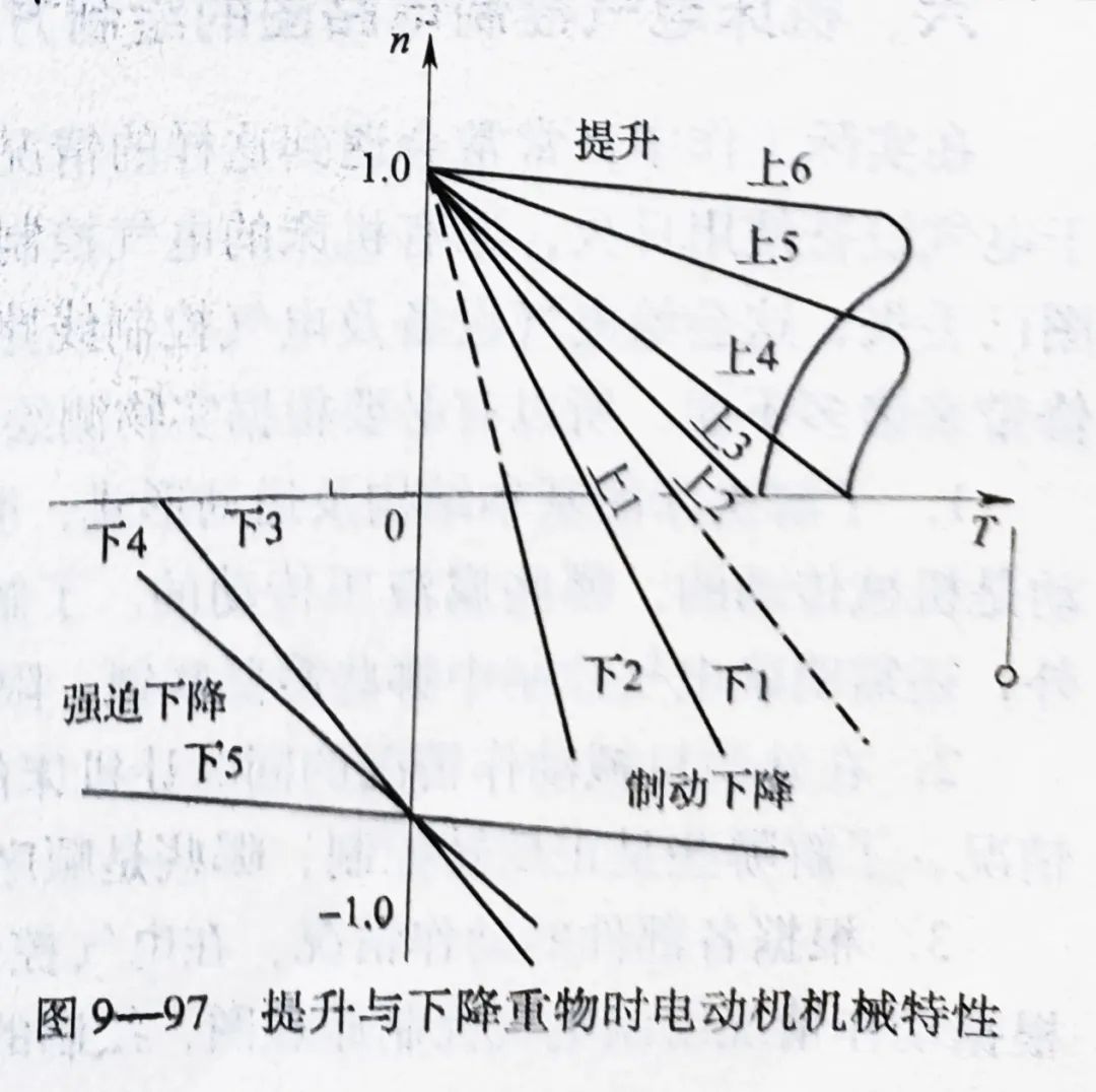 下圖9-97提升與下降重物時(shí)電動(dòng)機(jī)機(jī)械特性降重物時(shí),主令控制器也有6個(gè)擋位。根據(jù)重物的重量,可使電動(dòng)機(jī)工作在不同的狀態(tài)下。若重載下降,要求低速,電動(dòng)機(jī)可工作在倒拉反接制動(dòng)狀態(tài);若空鉤或輕載下降,必須采用強(qiáng)迫下降。在主令控制器下降的6個(gè)擋位中,前三個(gè)擋位即J、下1、下2為制動(dòng)下降;后三個(gè)擋位即下3、下4、下5為強(qiáng)力下降。如當(dāng)手柄由零位置扳到“J”擋位時(shí),S3、S6、S7、S8閉合使KM2、KM4、KM5得電吸合,電動(dòng)機(jī)通入正向電流,轉(zhuǎn)子繞組電阻切除兩段,但電磁抱閘將吊鉤緊緊抱住,吊鉤不動(dòng)。當(dāng)手柄置于下1與下2擋位時(shí),S3、S4、S6、S7閉合,KM3得電吸合,電磁抱閘松開,KM5、KM4相繼斷電釋放,特性曲線變軟,獲得機(jī)械特性中的下1、下2兩條特性,電動(dòng)機(jī)工作在倒拉反接制動(dòng)狀態(tài)。當(dāng)手柄置于下3、下4、下5三個(gè)擋位時(shí)S4、S5、S7、S8、S9、S10、S11、S12相繼閉合,KM4、KM5、KM6、KM7、KM8、KM9相繼通電吸合,電阻逐級(jí)切除,電動(dòng)機(jī)轉(zhuǎn)速逐級(jí)升高,電動(dòng)機(jī)工作在強(qiáng)力下降的下3、下4、下5三條特性曲線上。